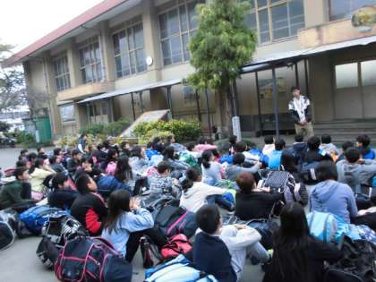 5年生全員,元気に帰ってきました。少し疲れていたけれど,保護者の方々や教職員に,元気な「ただいま!」の声で,帰校式をしました。