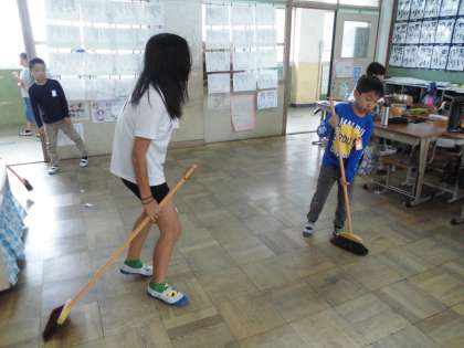 子どもたちは協力しながら,いつもとは違う掃除場所を一生懸命掃除していました。1年生は音楽室や図書室など,特別教室を掃除する体験は貴重で,高学年の子どもたちが優しく教えてあげていました。