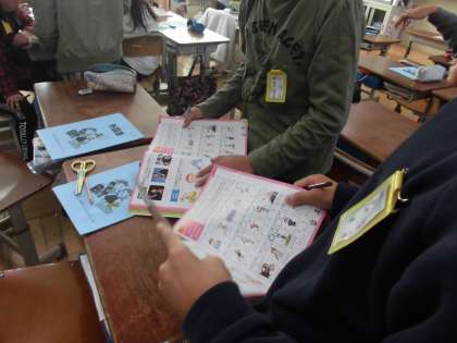 Can you play 〜?のフレーズを使って,友だちにインタビューをします。はずかしがくことなく,どんどん声に出して話しています。