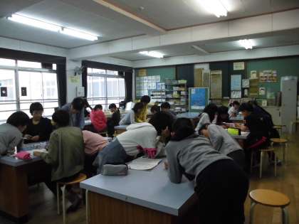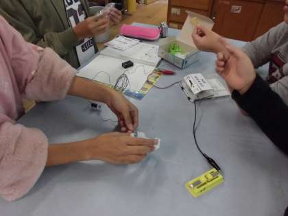 コイルを巻く回数?長さ?電池の数? 変える条件と変えない条件を考えながら,グループで協力して実験しています。