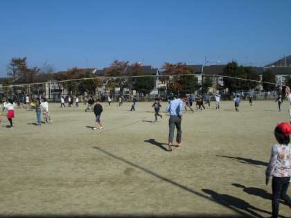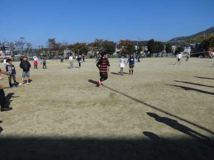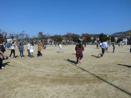 中間休みに,先生たちといっしょに大なわとびをしています。校長先生もとんでいます。どんどん子どもたちが集まってきました。