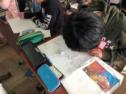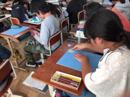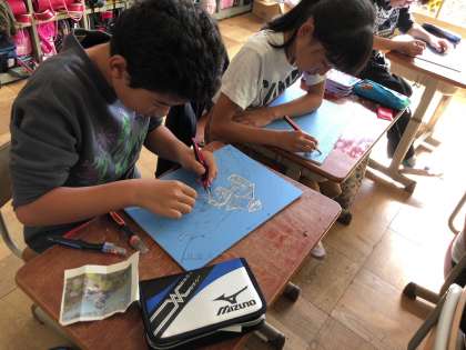 図工では,版画の学習をしています。テーマは「6年生で心に残っていること」です。1修学旅行2運動会3部活動・クラブ活動の3つに分けてその中の心に残っている場面を版画にしています。下絵の段階から構図にこだわり,背景や建物に合わせて彫刻刀の種類を変えながら,丁寧に彫っています。