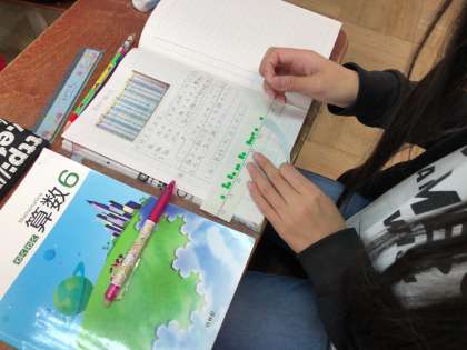 算数の学習では,「資料の調べ方」をしています。ソフトボールの資料から,数直線にシールを貼って,全体のちらばりを見ました。すると,ボールがとんだ平均が一緒だった1組と2組でも,数直線に表すと,全く違ったちらばり方になっていることが分かりました。