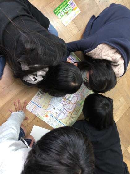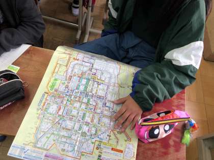 30日(金)に市内めぐりに行くため,各グループごとに行き先や行き方を決めています。学校を出発して,目的地に行くには,どの駅で降りたらいいのか,時間はどれくらいかかるのかなどを調べて,計画を立てています。当日も秋晴れの中,上手くまわれるように,しっかりと準備していきたいです。