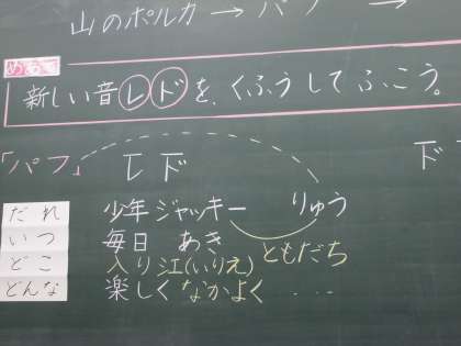 リコーダーの新しい音,レ,ドの音の出し方を学習しました。