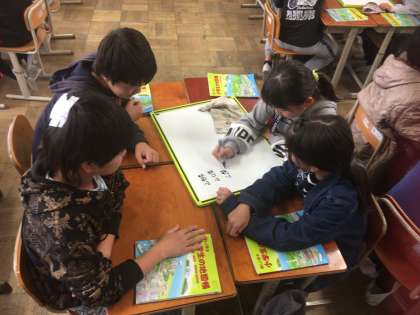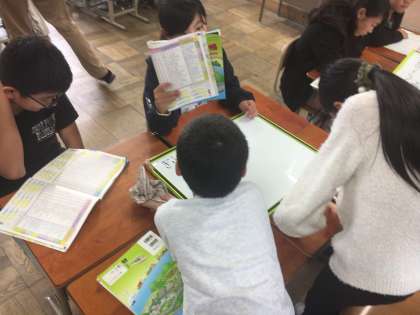 1組は社会科を体験しました。日本の都道府県の名前を使ってしりとりをしたり,都道府県の面積を調べたりとグループで活動して楽しそうにしていました。