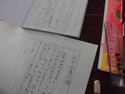 「はじめ」「中」「終わり」の組み立てにそって,やっと,やっと,やっと,物語が完成しました。下書きを清書しています。