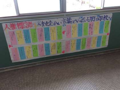 人権週間の取り組みとして考えた人権標語を掲示しています。みんなが人権について考え,日野小学校があたたかくなるような標語ばかりです。