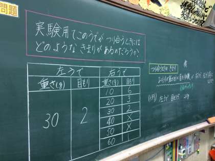 てこが水平につりあうときのきまりや傾くときのきまりについてまとめ,話し合いました。