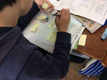 これまでに国語科で学習した方法を使って卒業文集の構成を考えました。付箋を使って考えたり紙に書いて構成の順を考えたりと試行錯誤を繰り返していました。