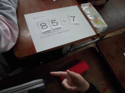 前半は,4年生の学習内容の復習プリントをしました。後半は,4年生までに学習した四則計算ゲームをしました。めくったカードの数字や演算から,答えを考えます。わいわい盛り上がりました。
