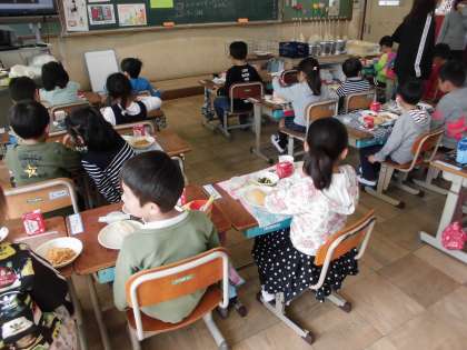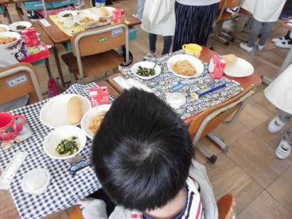 手洗い,机の上の用意,身支度を整え,いざ給食室のサービスホールへ! 6年生のお兄さんお姉さんに手伝ってもらいながら,食缶を運んだり,配膳のお仕事をしたり,当番活動をがんばりました。