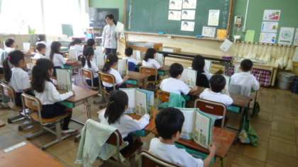 1年生の国語の学習で,先生の声に合わせて読みました。口の形に気を付けながら大きな声ではっきりと読むことができました。