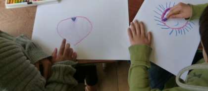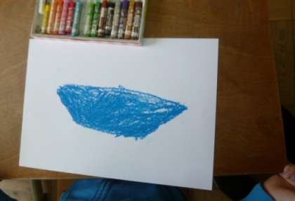 図画工作の学習では,好きな色・好きな形でみんながにこにこになるような太陽をかきました。色のぬり方やクレパスの使い方を工夫して,指で色をのばしたりしながら,かくことができていました。