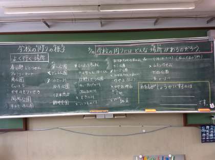 自分たちの学校の周りで「よく行く場所」や「おすすめしたい場所」を出し合いました。商店や公園だけでなく「名前がついていないけれど猫がたくさんいる竹藪」や「チューリップが咲いている小川」など校区のいろいろな場所をみんなで出し合いました。