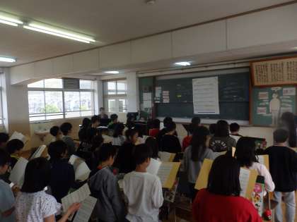音楽の授業が始まりました。発声練習をして校歌とビリーブを歌いました。素晴らしい歌声で,驚きました。この一年でたくさんの歌を歌って,どんどん成長しましょう♪