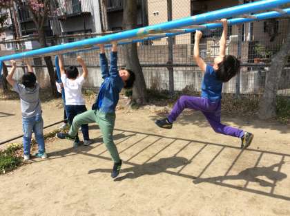 休み時間に遊具で楽しく遊んでいます。安全に気をつけながらも登ったり,滑ったり,いろいろな渡り方をうんていで試したり…いろいろな遊び方で楽しんでいます。