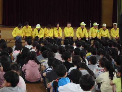 毎朝,児童の登校の安全の見守りをしてくださっている「見守り隊」の方々に,感謝の言葉と,全校合唱をおくりました。