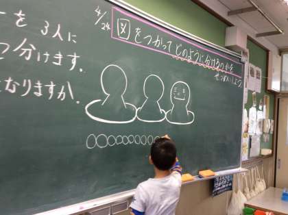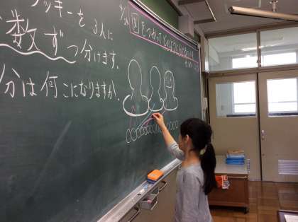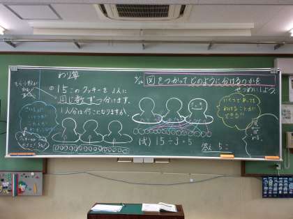 15個のクッキーを3人に同じ数ずつ分ける時,どのような配り方があるのかを考えました。「1こずつ配るといい!」「いや,5個一度に配るといい!」「3個とりあえず配って残りは1個ずつ配っていく!」といろいろな考え方があり,それぞれのメリット,デメリットについて話し合いました。