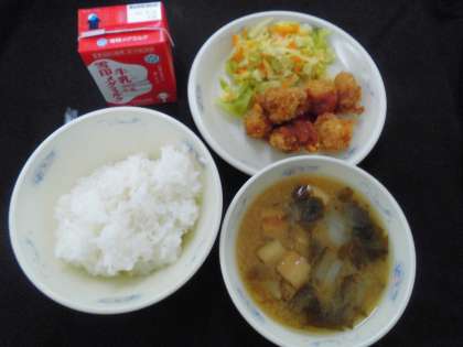 今日の給食は,ごはん・みそ汁・チキンカツ・ソテー・牛乳です。