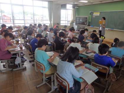 社会科の学習の流れを確認しています。さらに低い土地で水害の多い地域ではどのような工夫がされているのかを予想しました。たくさんの予想が出ました。