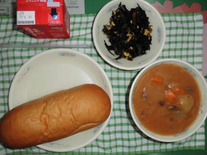 今日の給食は,ミルクコッペパン・ビーフシチュー・ひじきのソテー・牛乳です。