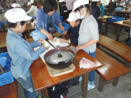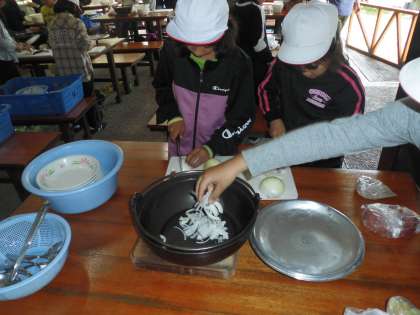 「玉ねぎってどうやって切るの?」「切ってたら目が痛い。」と,最初は危なっかしい場面もありましたが,みんなで声を掛け合いアドバイスしあいながら,材料を準備していました。
