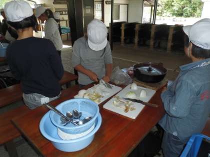 今年の野外炊事は,「ハヤシライス」です。調理と火おこしに分かれてスタートしました。