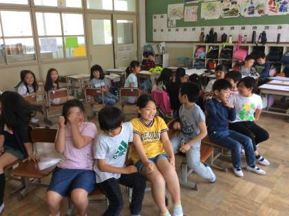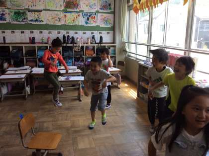 中間休みにクラスで椅子取りゲームをしました。負けてしまった子たちも音楽に合わせて踊って楽しそうに活動していました。