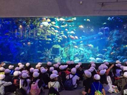 鳥羽水族館見学の様子です。4年生のみんながたくさんの魚に見とれているところです。迫力満点!!
