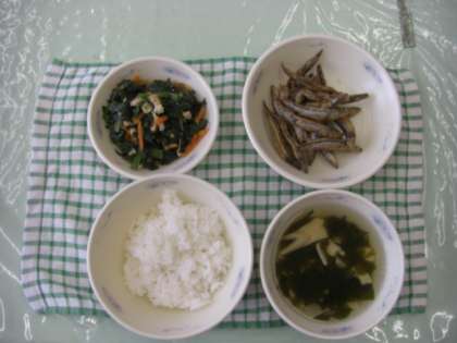 今日の給食は,和(なごみ)献立です。ほうれんそうのにびたし,きびなごのこはくあげ,ごはん,わかたけじるです。春を味わって,おいしくたべてくださいね。