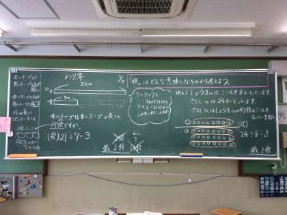 算数科では何倍になるのかを考える問題に取り組みました。そもそも「〜倍」とはどんな意味なのかをみんなで考えました。「同じものがいくつあるのか」ということがわかると「問題が簡単になった!」と言って解いていました。