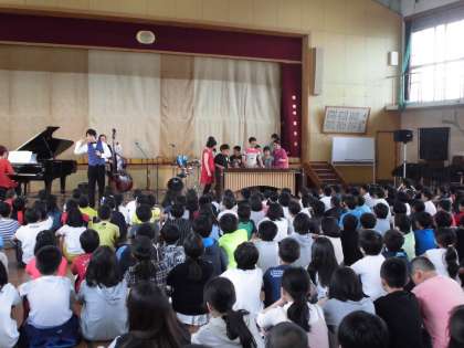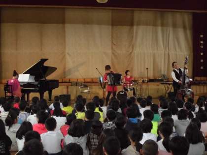 即興なのに,音楽とぴったり合って,すばらしいセッションでした。全校のみんなは,手拍子で応援しました。