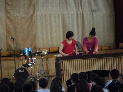 音楽鑑賞会の中で,6年生はマリンバの連打「トレモロ」体験をさせていただきました。