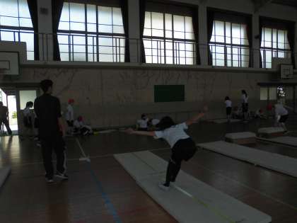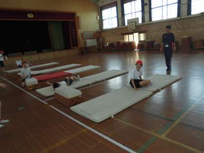 マット運動の学習です。回転系や倒立系の技を練習しています。