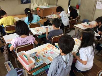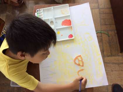 校外学習の思い出に色をつけていきます。人の肌の色はどんな色なのかを自分の手と比べながら塗っていきました。完成が楽しみです!