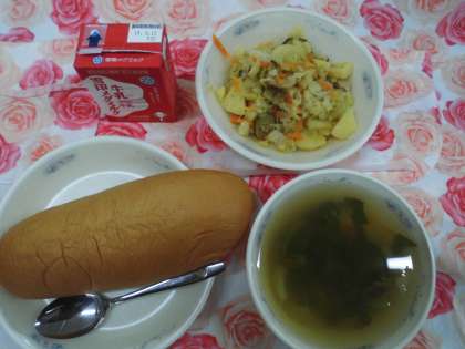 今日の給食は,黒糖コッペパン・豆腐と青菜のスープ・ソーセージと野菜の炒めナムル・牛乳でした。