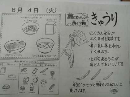 給食カレンダーでは,「夏におしいしい野菜」を紹介しています。今日は,きゅうりについて紹介しています。暑い夏に体を冷やす働きをするきゅうりを食べて,これから本格的にやってくる,暑い夏を乗り切ろう!!