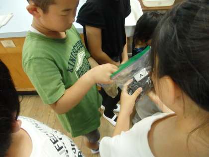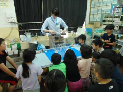 サントリーの方々に来ていただき,水育の学習をしていただきました。森林には,水をたくわえる役割と水をきれいにする役割があることを実験を通して知ることができました。実験では,よごれていた水が森林を通ることできれいな水となってでてくると,「きれい!」「この水飲めそう!」と水をきれいにする森林の力に感動していました。