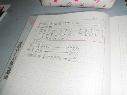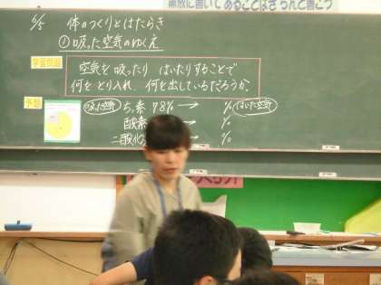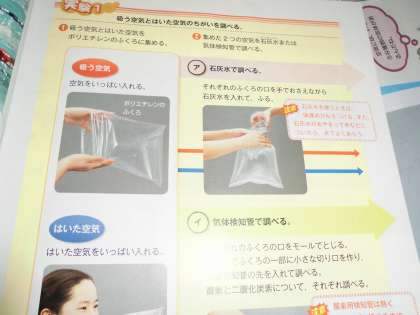 人は,空気を吸ったりはいたりすることで,何を取り入れ,何を出しているのか,吸った空気とはいた空気の成分のちがいを考えました。