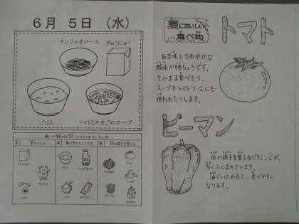 給食カレンダーにも,トマトとピーマンの栄養素について紹介しています。しっかり食べて,じめじめした梅雨や暑い夏を元気に乗り切りましょう。