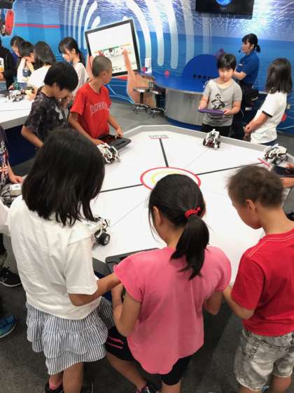 自分たちでタブレットを操作して、EV3に司令を出します。アームを動かして目の前の箱を取るというミッションをクリアしようとみんな頑張っています。