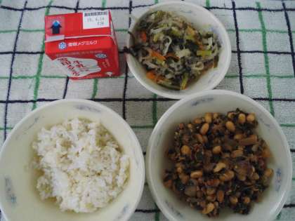 今日の給食は,麦ごはん・肉みそいため・切干し大根のごま煮・牛乳です。