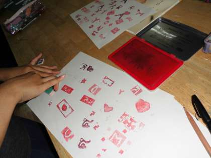 図案を起こして,凹彫り,凸彫りを選んで,カッターで彫りました。一番楽しいのは,押してみる時です。