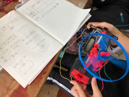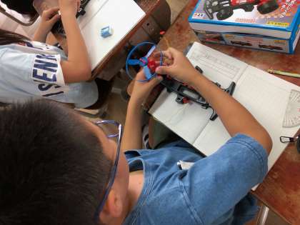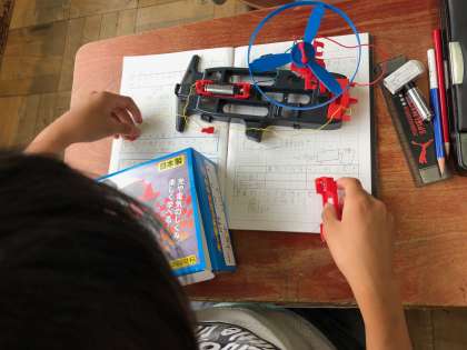 電池のはたらきについて学習をしています。モーターをもっと早く回すためには,どうすればよいのかを実験を通して考えました。乾電池のつなぎ方には,「直列つなぎ」と「並列つなぎ」があることを知り,それぞれのつなぎ方で試してみました。