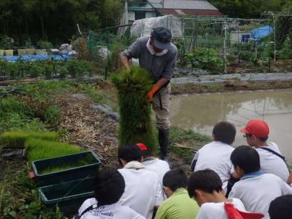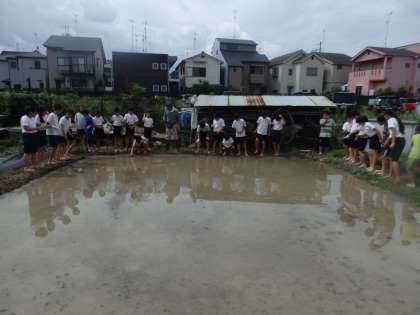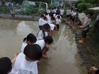 地域の方にお世話になって,田植え体験をさせていただきました。最初に植え方を聞いて,いざスタート。