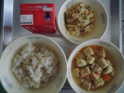 今日の給食は,麦ごはん・高野豆腐のそぼろに・ごまずに・牛乳です。先日は,黄色の食べ物を紹介しましたが,今日の給食カレンダーでは,緑の食べ物を紹介しています。