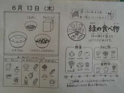 赤・黄・緑の食材をバランスよく食べて,暑い夏や梅雨空を吹き飛ばしましょう。