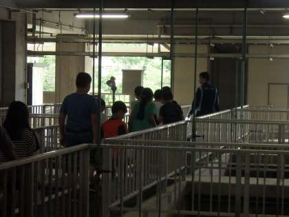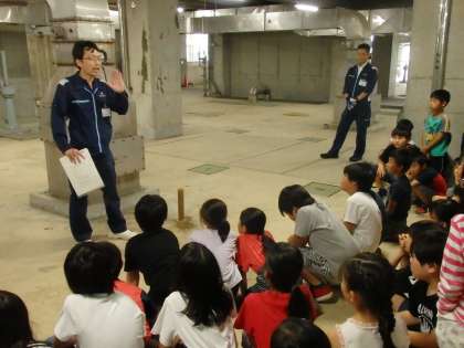 施設内の見学をさせてもらいました。私たちが使った水は,水環境保全センターで1日ほどかけてきれいな水にされます。初めは汚れていた水も,最後の『最終沈でん池』のタンクの水は見違えるほどきれいな水になっていて,「きれい」「はじめの水と全然ちがう」と驚きの声があがっていました。