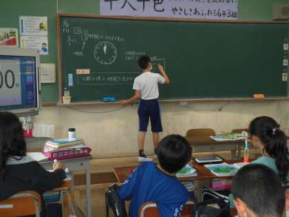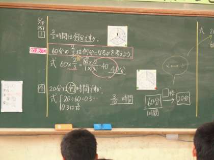 今日は,分数を使って時間を表しました。時計の図を使って考えたり,箱をかいて考えたり・・・。最終的に式に表しました。